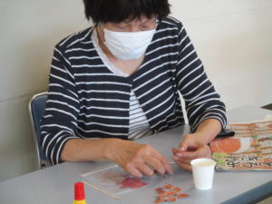 9月のおたよりは、水をつけた綿棒で新聞紙を丸く切り取りとった ❝ぶどう❞ や、秋空を飛んでいく ❝赤とんぼ❞ の絵手紙を作成しました。